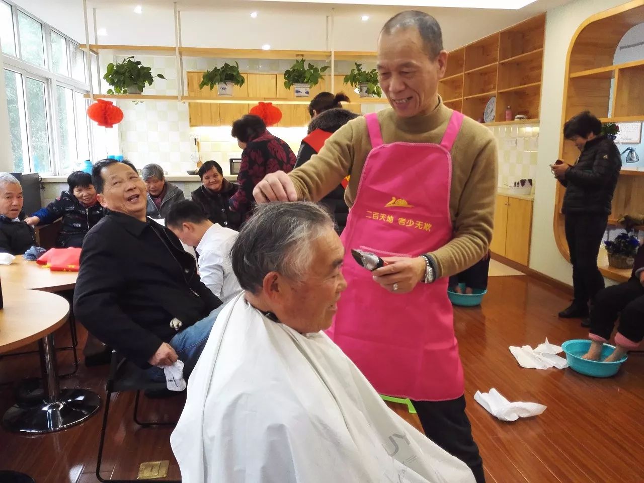 活動開始沒幾分鐘,義務(wù)理發(fā)區(qū)就排起了長長的隊伍,二百的專業(yè)理發(fā)人員“朱師傅”一邊仔細地為每一位老年者理發(fā),一邊同他們聊家常,爽朗的笑聲充斥著整個大廳。